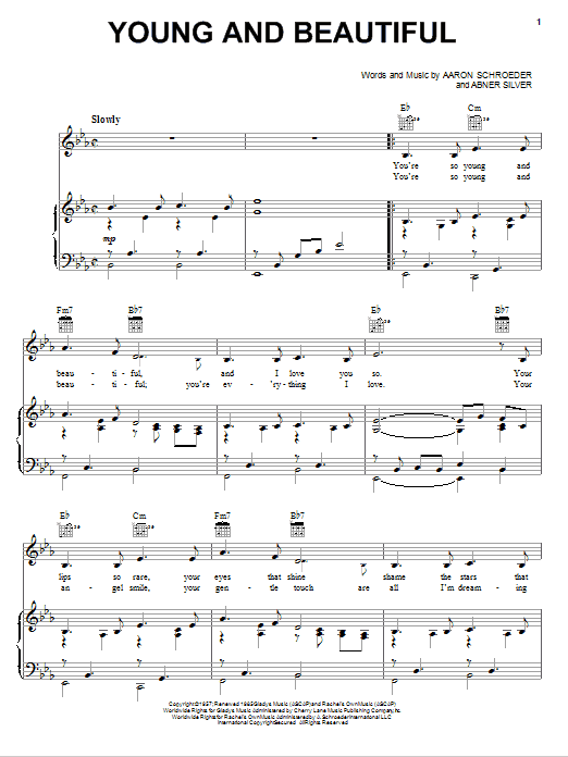 Download or print Elvis Presley Young And Beautiful sheet music, chords and digital score arranged for Piano, Vocal & Guitar Chords (Right-Hand Melody). This Pop score includes 2 page(s).