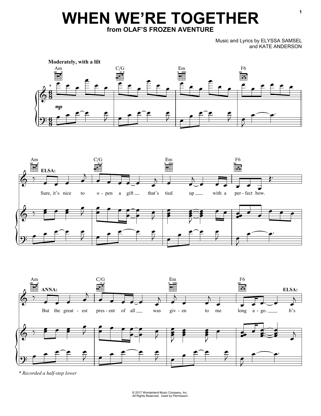 Download or print Kate Anderson When We're Together (from Olaf's Frozen Adventure) sheet music, chords and digital score arranged for Easy Piano. This Children score includes 7 page(s).