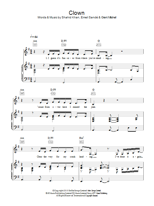 Download or print Emeli Sandé Clown sheet music, chords and digital score arranged for Easy Piano. This Pop score includes 5 page(s).