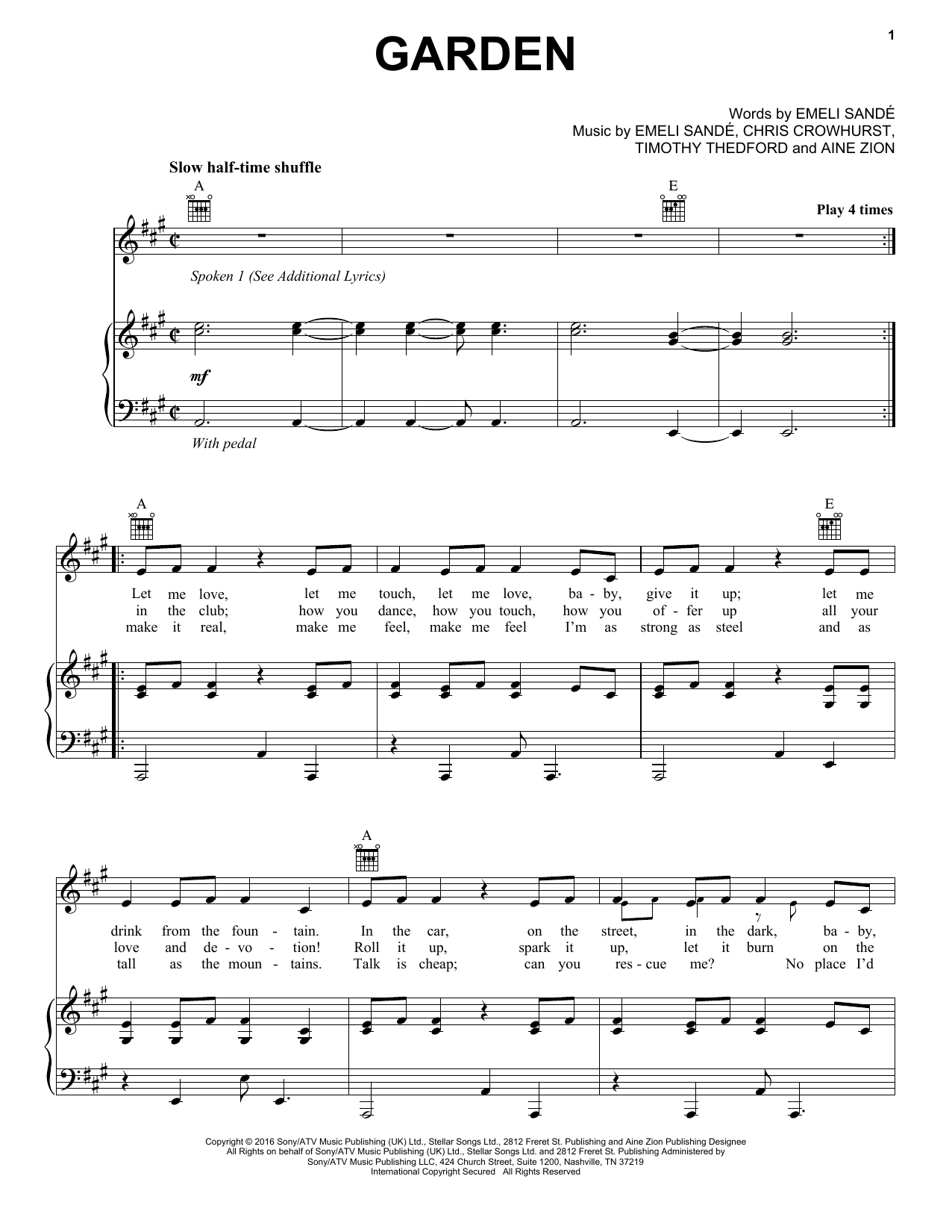 Download or print Emeli Sande featuring Jay Electronica & Aine Zion Garden sheet music, chords and digital score arranged for Piano, Vocal & Guitar Chords (Right-Hand Melody). This Pop score includes 5 page(s).