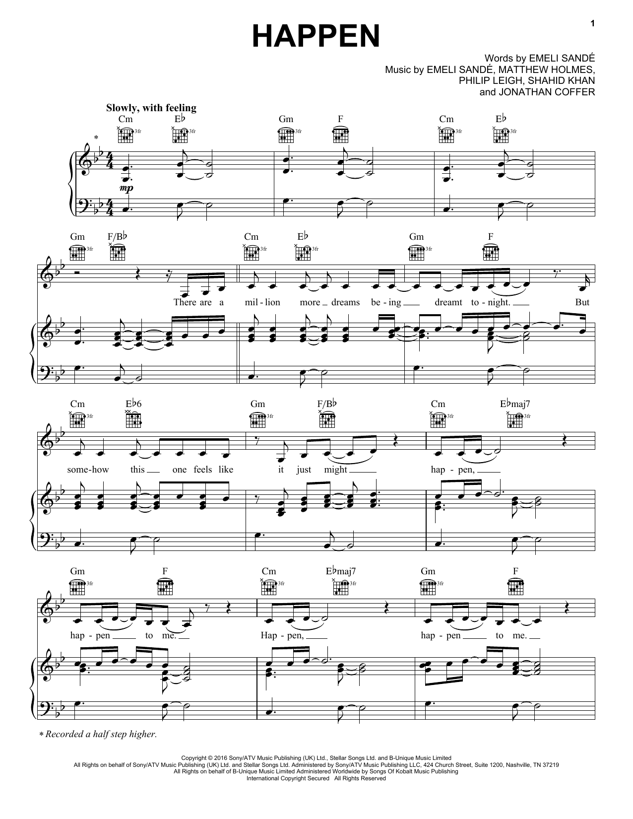 Download or print Emeli Sandé Happen sheet music, chords and digital score arranged for Piano, Vocal & Guitar Chords (Right-Hand Melody). This Pop score includes 5 page(s).