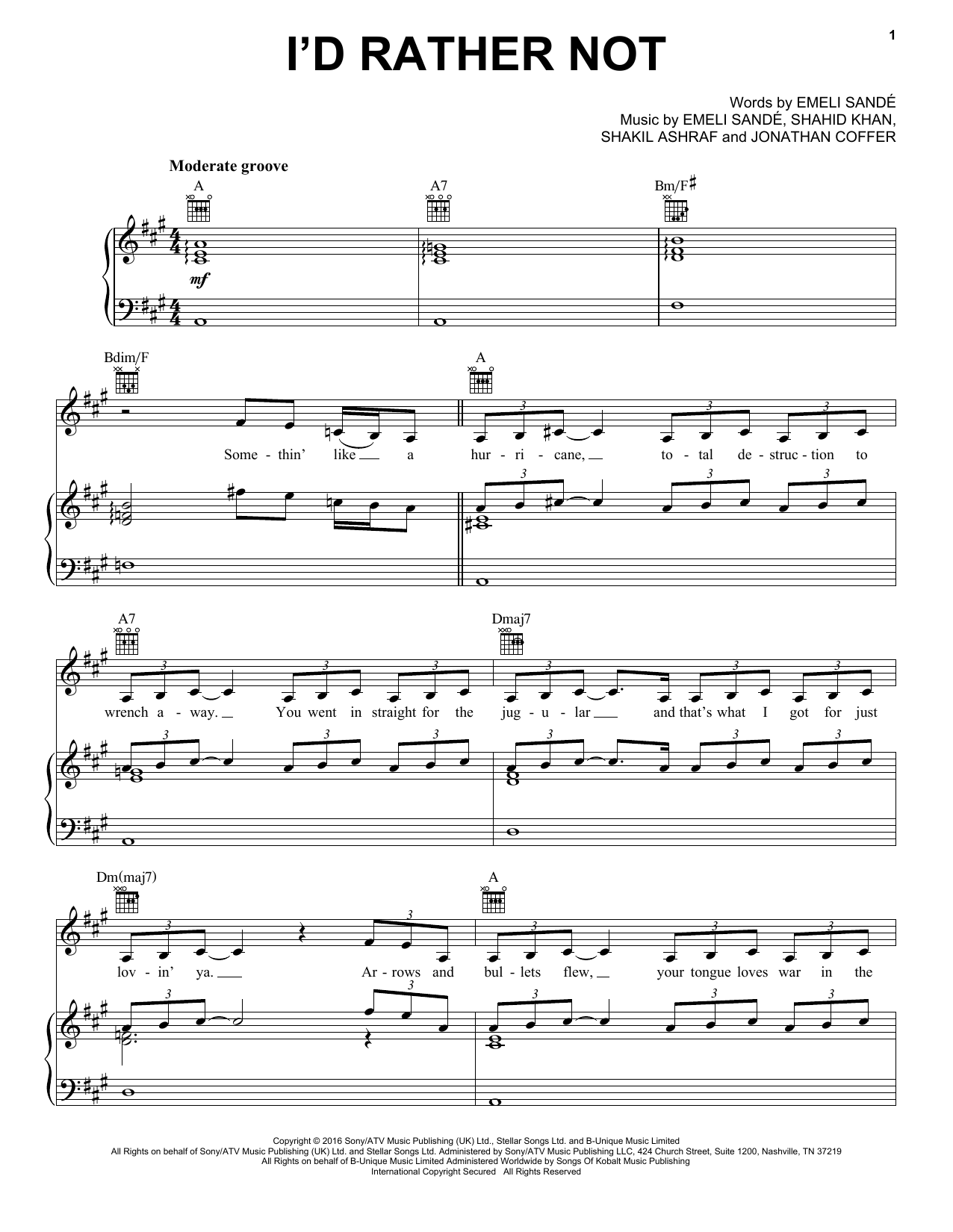 Download or print Emeli Sandé I'd Rather Not sheet music, chords and digital score arranged for Piano, Vocal & Guitar Chords (Right-Hand Melody). This Pop score includes 6 page(s).