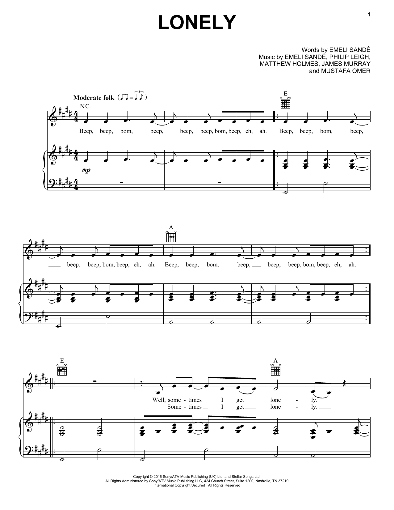 Download or print Emeli Sandé Lonely sheet music, chords and digital score arranged for Piano, Vocal & Guitar Chords (Right-Hand Melody). This Pop score includes 5 page(s).