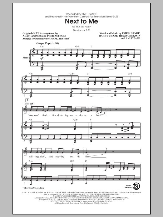 Download or print Mark Brymer Next To Me sheet music, chords and digital score arranged for SSA Choir. This Pop score includes 10 page(s).
