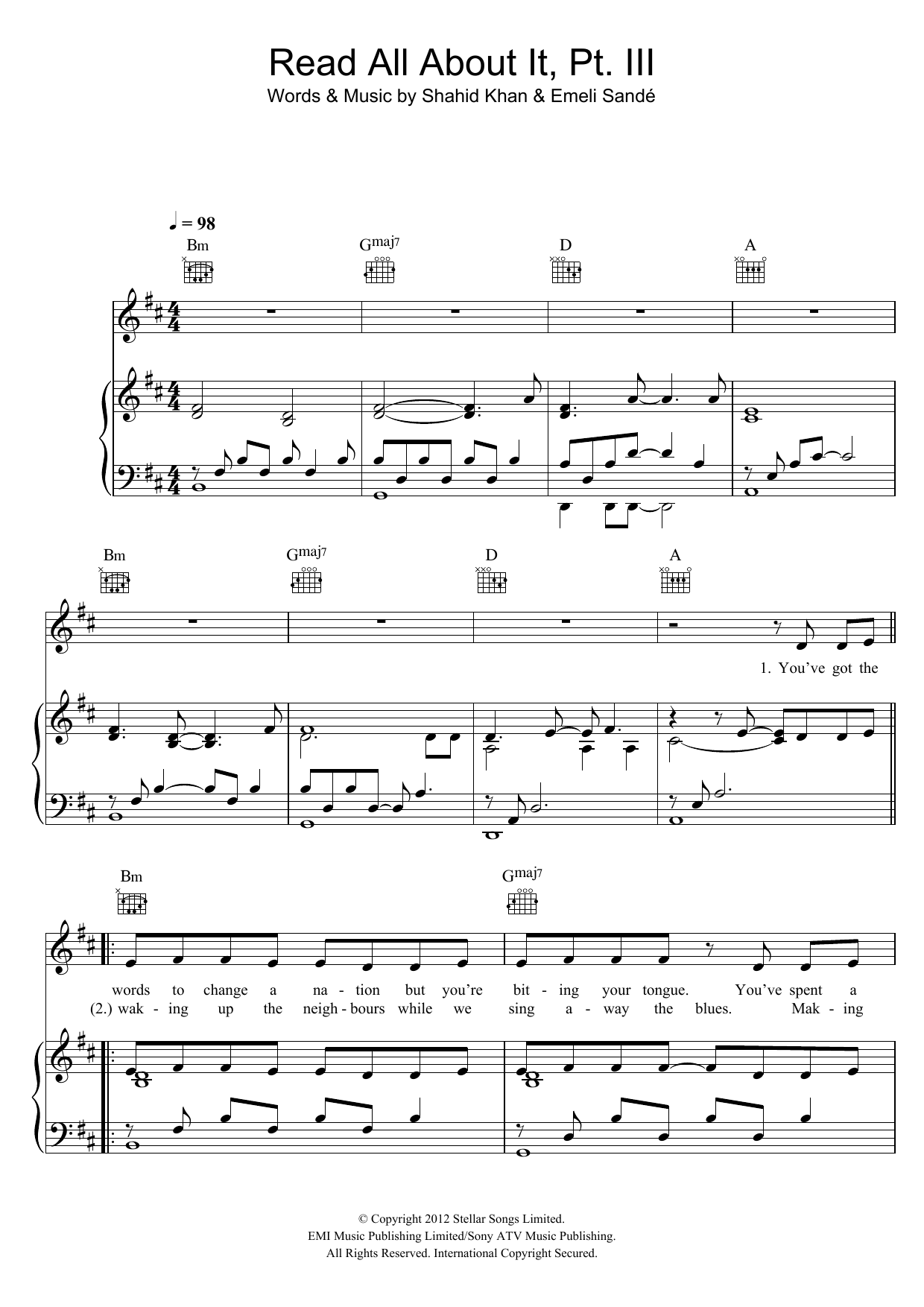 Download or print Emeli Sandé Read All About It, Part III sheet music, chords and digital score arranged for Piano, Vocal & Guitar Chords (Right-Hand Melody). This Pop score includes 6 page(s).