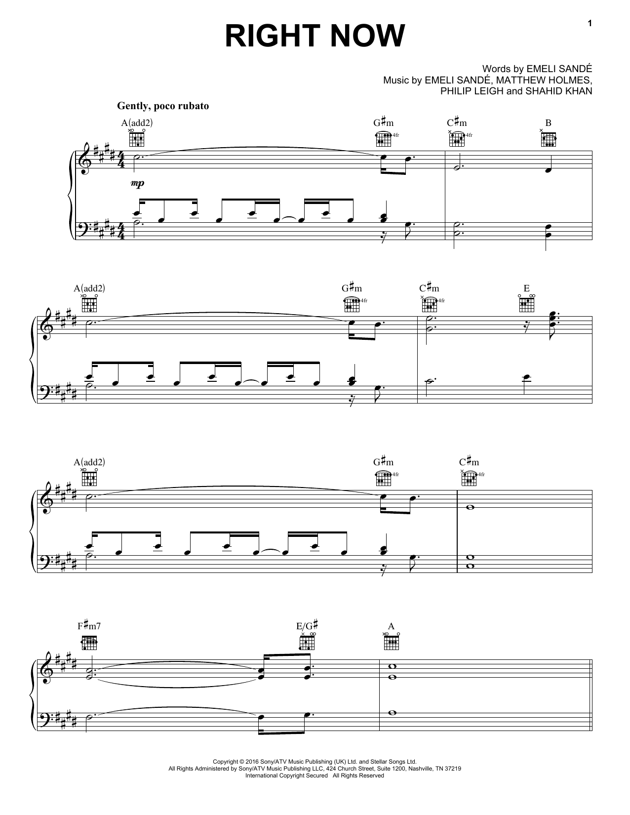 Download or print Emeli Sandé Right Now sheet music, chords and digital score arranged for Piano, Vocal & Guitar Chords (Right-Hand Melody). This Pop score includes 3 page(s).