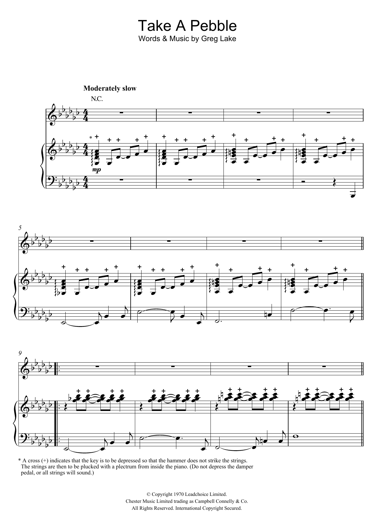 Download or print Emerson, Lake & Palmer Take A Pebble sheet music, chords and digital score arranged for Piano, Vocal & Guitar Chords. This Rock score includes 16 page(s).