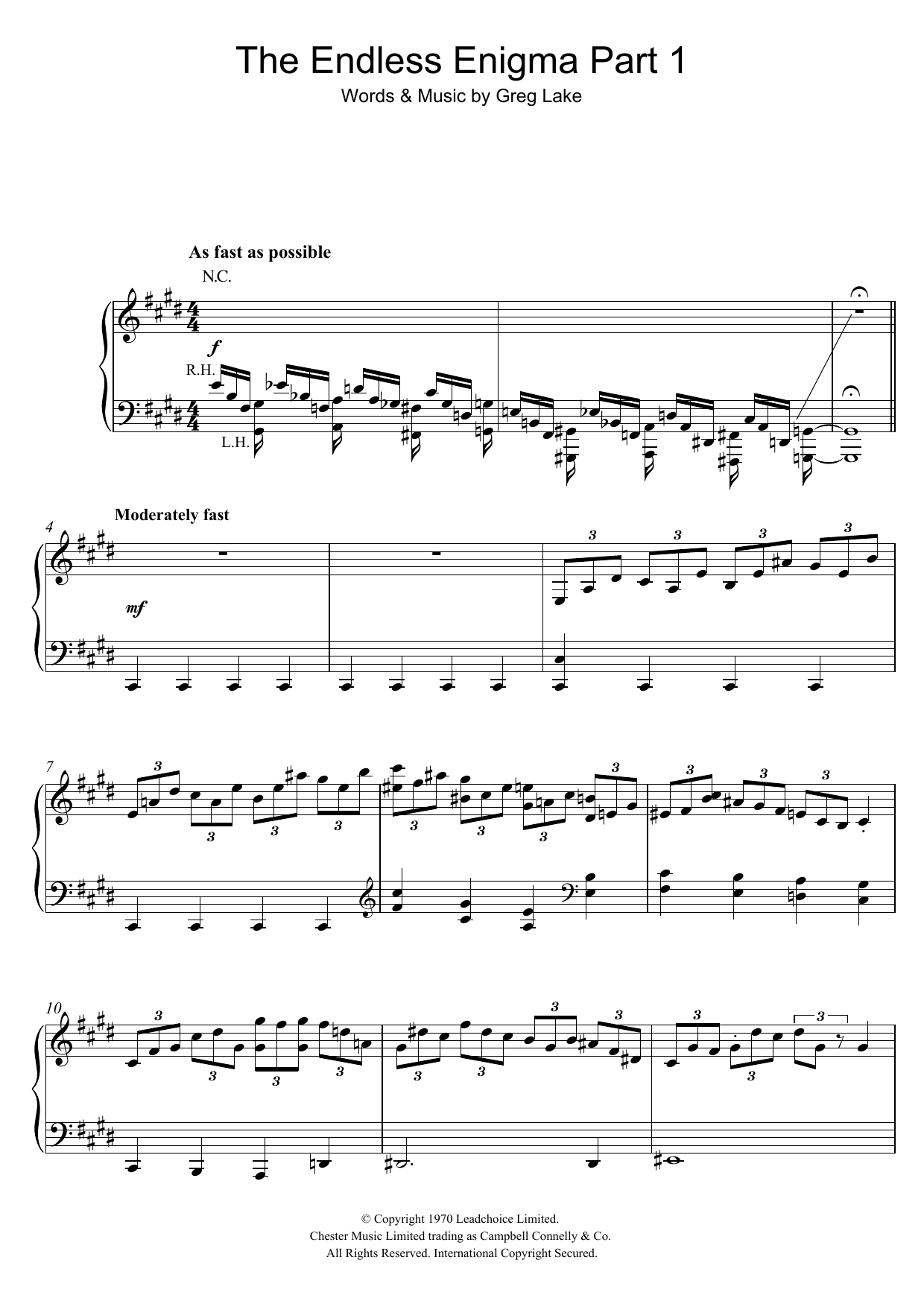 Download or print Emerson, Lake & Palmer The Endless Enigma Part 1 sheet music, chords and digital score arranged for Piano, Vocal & Guitar Chords. This Rock score includes 7 page(s).