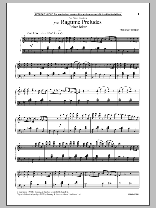 Download or print Emerson Peters Poker Joker (from Ragtime Preludes) sheet music, chords and digital score arranged for Piano Solo. This Jazz score includes 3 page(s).