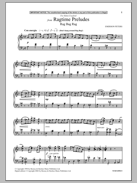 Download or print Emerson Peters Rag Bag Rag (from Ragtime Preludes) sheet music, chords and digital score arranged for Piano Solo. This Jazz score includes 4 page(s).