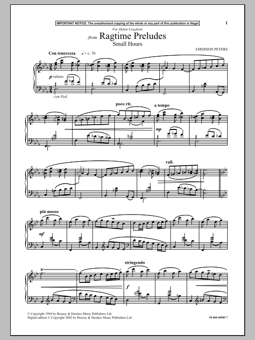 Download or print Emerson Peters Small Hours (from Ragtime Preludes) sheet music, chords and digital score arranged for Piano Solo. This Classical score includes 2 page(s).