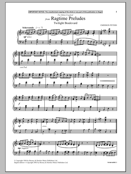 Download or print Emerson Peters Twilight Boulevard (from Ragtime Preludes) sheet music, chords and digital score arranged for Piano Solo. This Jazz score includes 2 page(s).