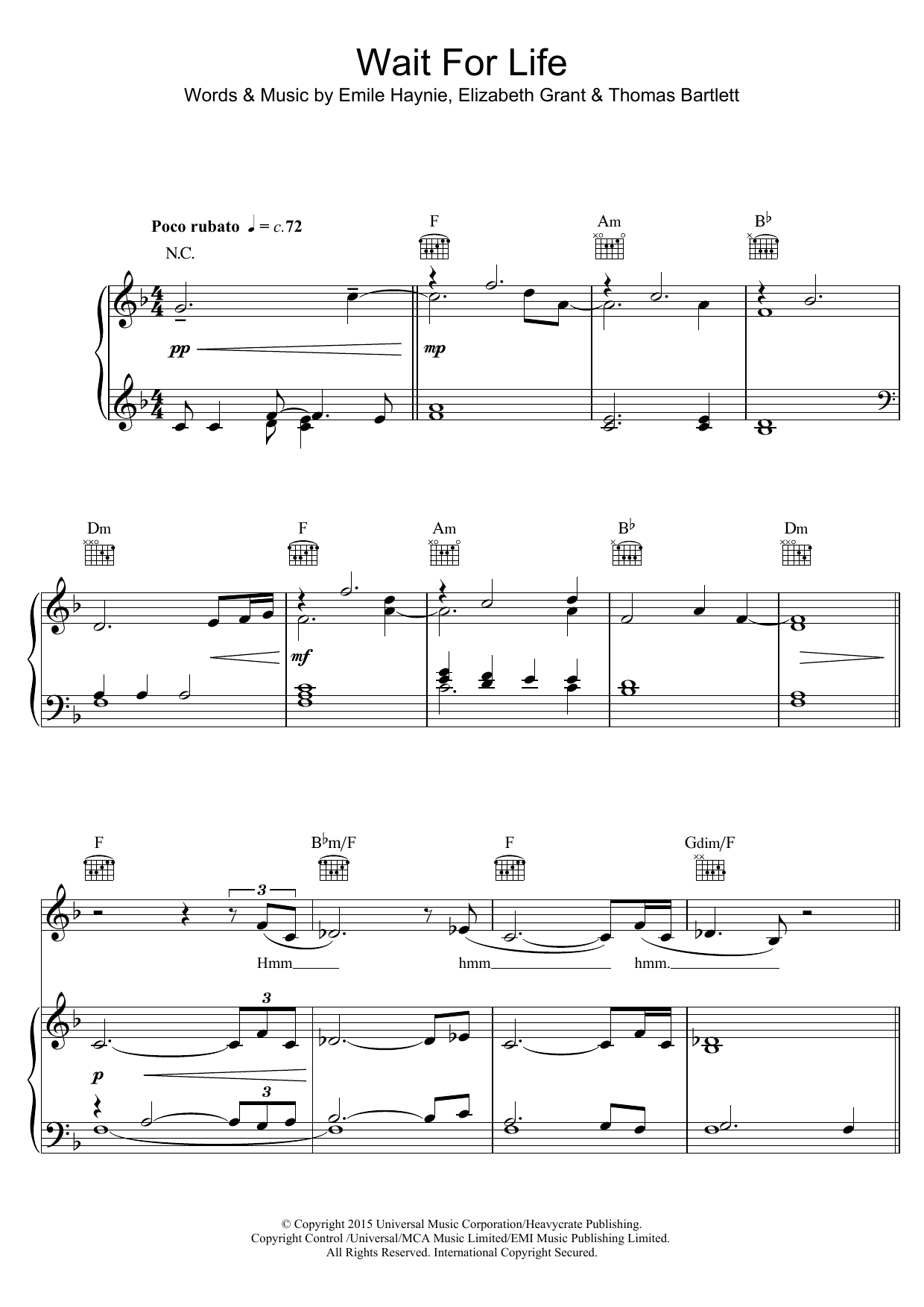 Download or print Emile Haynie Wait For Life (featuring Lana Del Rey) sheet music, chords and digital score arranged for Piano, Vocal & Guitar Chords. This Pop score includes 6 page(s).