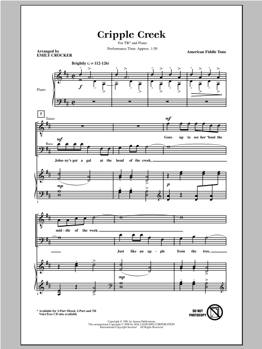 Download or print Emily Crocker Cripple Creek sheet music, chords and digital score arranged for TB Choir. This Folk score includes 7 page(s).