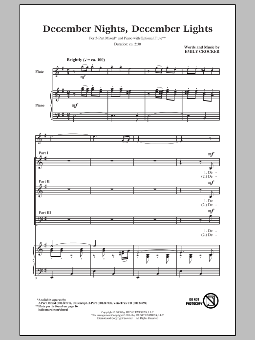Download or print Emily Crocker December Nights, December Lights sheet music, chords and digital score arranged for 3-Part Mixed Choir. This Christmas score includes 2 page(s).