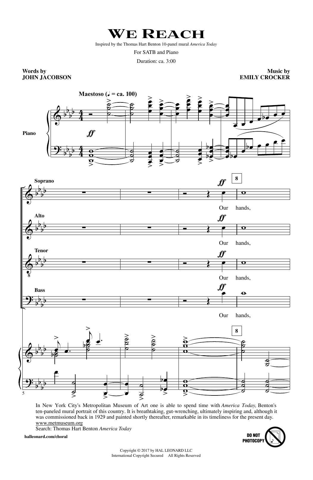 Download or print Emily Crocker We Reach sheet music, chords and digital score arranged for SAB Choir. This Concert score includes 12 page(s).