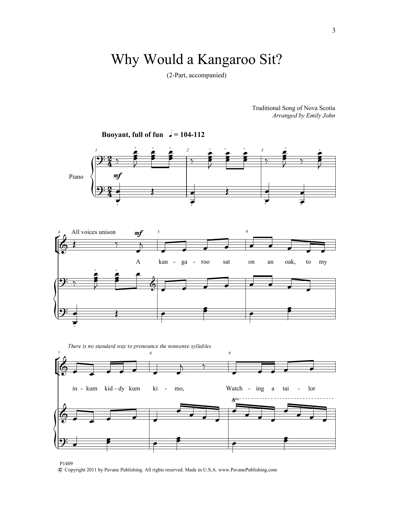 Download or print Emily John Why Would a Kangaroo Sit? sheet music, chords and digital score arranged for 2-Part Choir. This Children score includes 6 page(s).