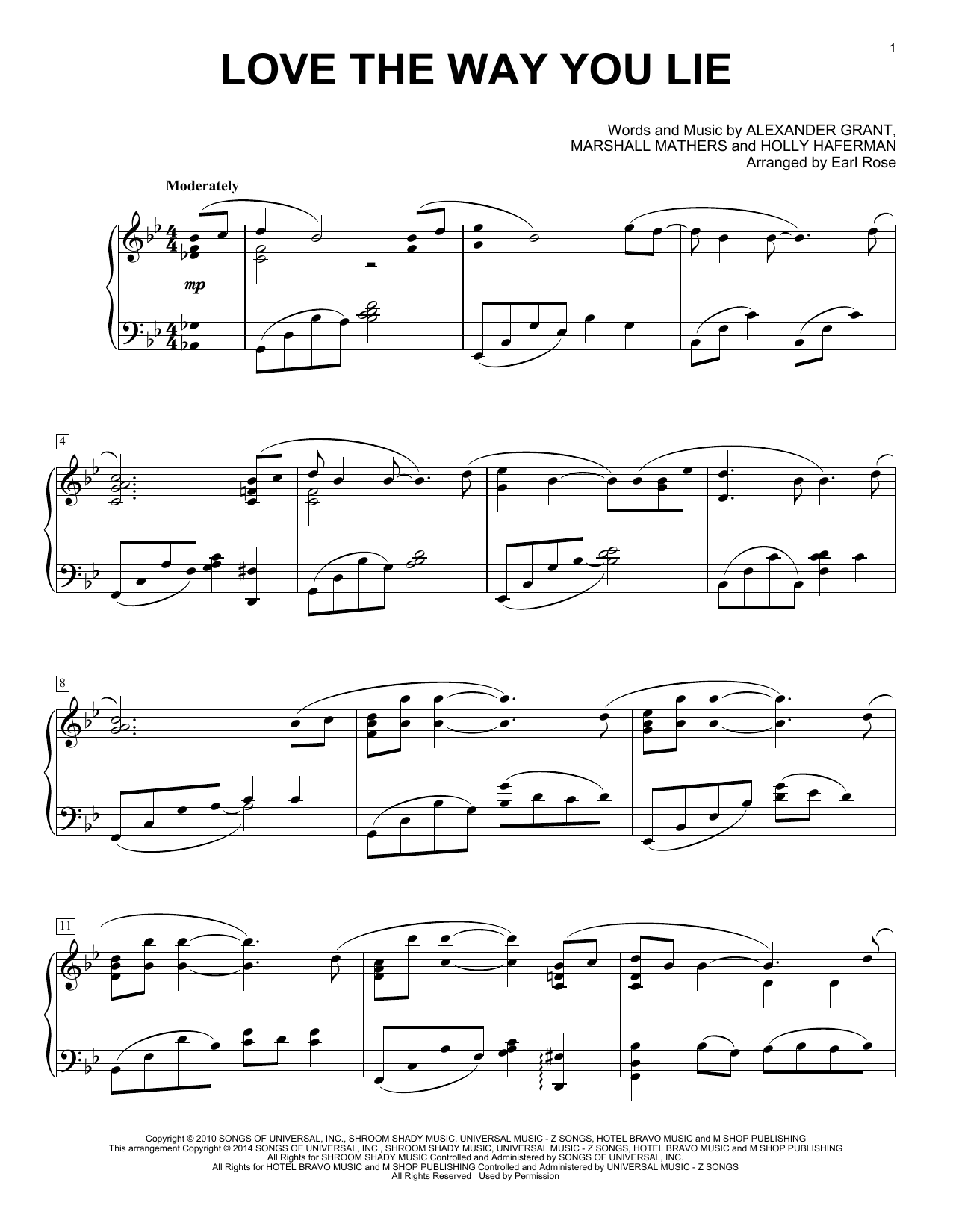 Download or print Earl Rose Love The Way You Lie sheet music, chords and digital score arranged for Piano Solo. This Jazz score includes 5 page(s).