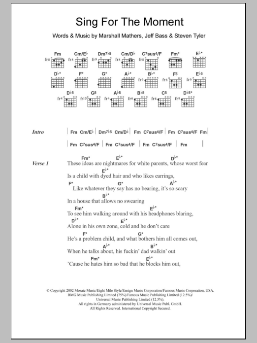 Download or print Eminem Sing For The Moment sheet music, chords and digital score arranged for Guitar Chords/Lyrics. This Pop score includes 5 page(s).