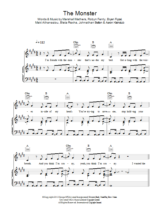 Download or print Eminem feat. Rihanna The Monster sheet music, chords and digital score arranged for Piano, Vocal & Guitar Chords. This Hip-Hop score includes 7 page(s).