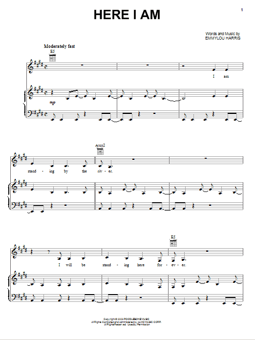 Download or print Emmylou Harris Here I Am sheet music, chords and digital score arranged for Piano, Vocal & Guitar Chords (Right-Hand Melody). This Country score includes 8 page(s).