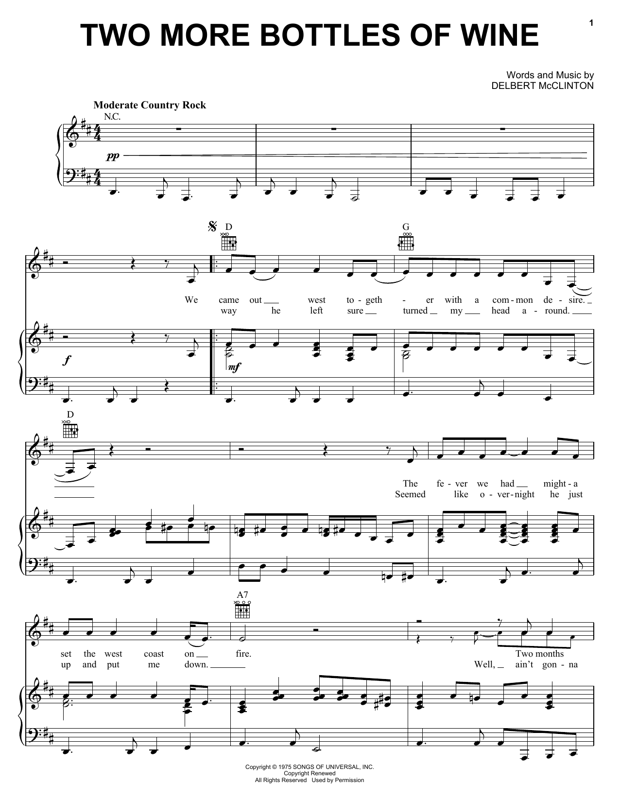 Download or print Emmylou Harris Two More Bottles Of Wine sheet music, chords and digital score arranged for Piano, Vocal & Guitar Chords (Right-Hand Melody). This Country score includes 4 page(s).