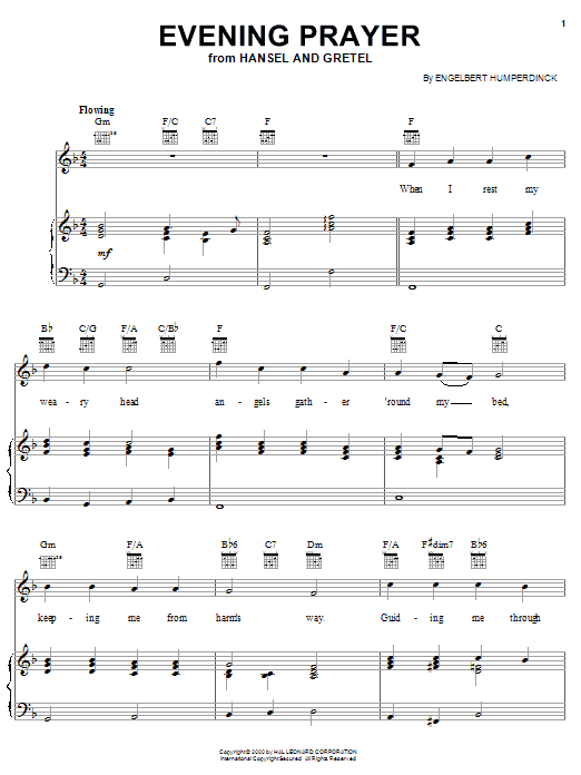 Download or print Engelbert Humperdinck Evening Prayer sheet music, chords and digital score arranged for Piano, Vocal & Guitar Chords (Right-Hand Melody). This Children score includes 2 page(s).