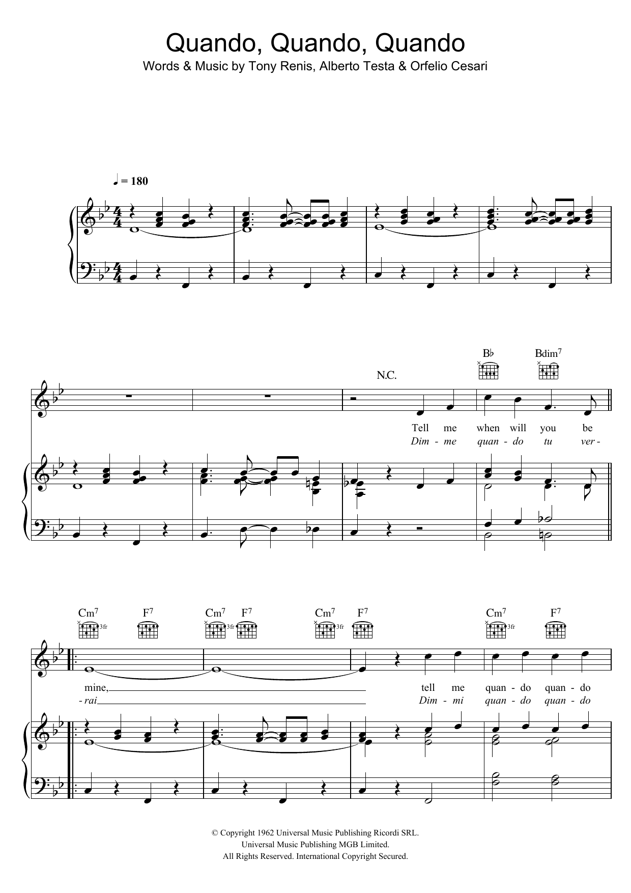 Download or print Engelbert Humperdinck Quando, Quando, Quando sheet music, chords and digital score arranged for Piano, Vocal & Guitar Chords. This Standards score includes 5 page(s).