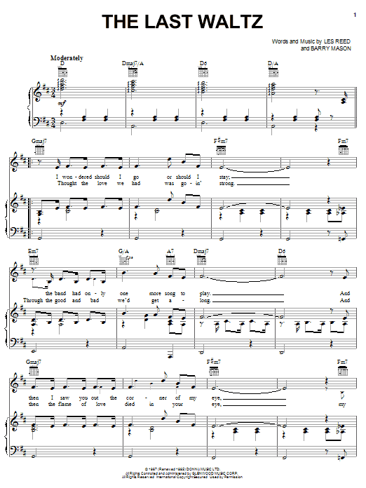 Download or print Engelbert Humperdinck The Last Waltz sheet music, chords and digital score arranged for Piano & Vocal. This Pop score includes 4 page(s).