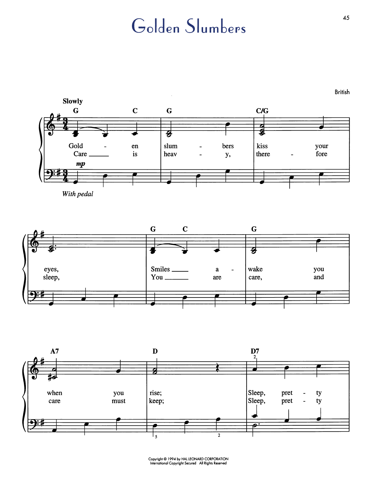 Download or print English Folksong Golden Slumbers sheet music, chords and digital score arranged for Easy Piano. This Children score includes 3 page(s).