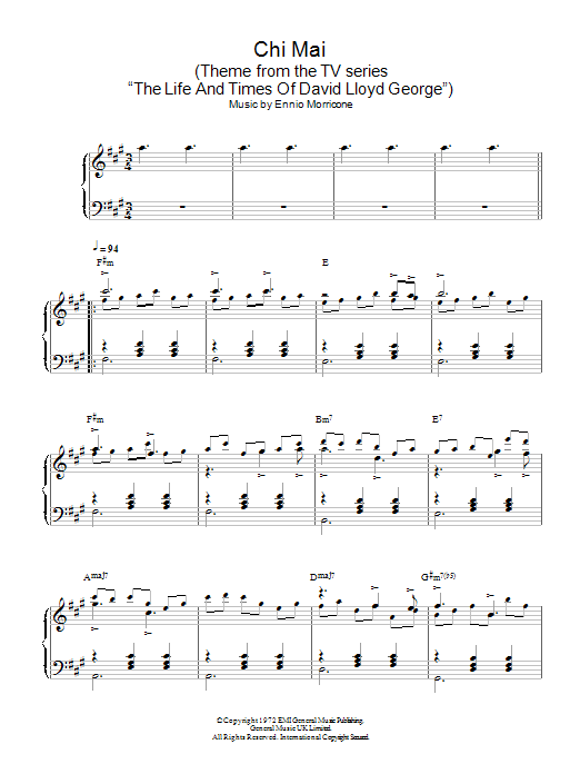 Download or print Ennio Morricone Chi Mai (Theme from The Life And Times Of David Lloyd George) sheet music, chords and digital score arranged for Piano Solo. This Film/TV score includes 4 page(s).