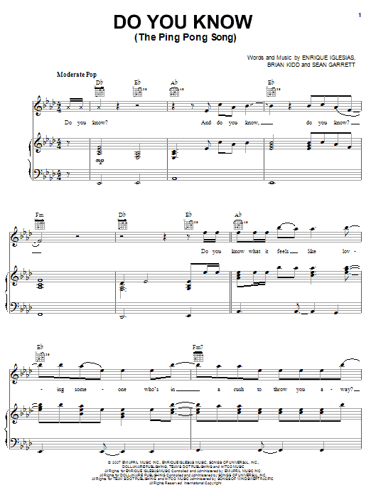 Download or print Enrique Iglesias Do You Know? (The Ping Pong Song) sheet music, chords and digital score arranged for Piano, Vocal & Guitar Chords (Right-Hand Melody). This Pop score includes 9 page(s).