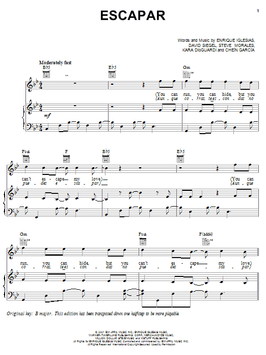 Download or print Enrique Iglesias Escapar sheet music, chords and digital score arranged for Piano, Vocal & Guitar Chords (Right-Hand Melody). This Latin score includes 6 page(s).
