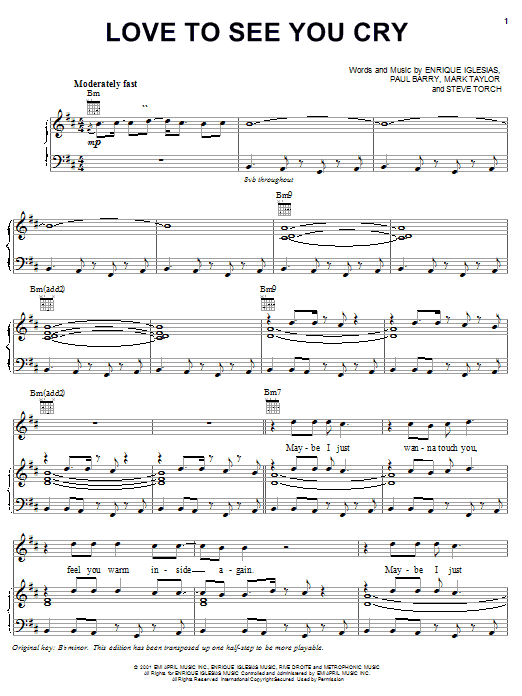 Download or print Enrique Iglesias Love To See You Cry sheet music, chords and digital score arranged for Piano, Vocal & Guitar Chords (Right-Hand Melody). This Latin score includes 8 page(s).