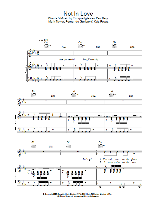 Download or print Enrique Iglesias Not In Love sheet music, chords and digital score arranged for Lead Sheet / Fake Book. This Latin score includes 3 page(s).