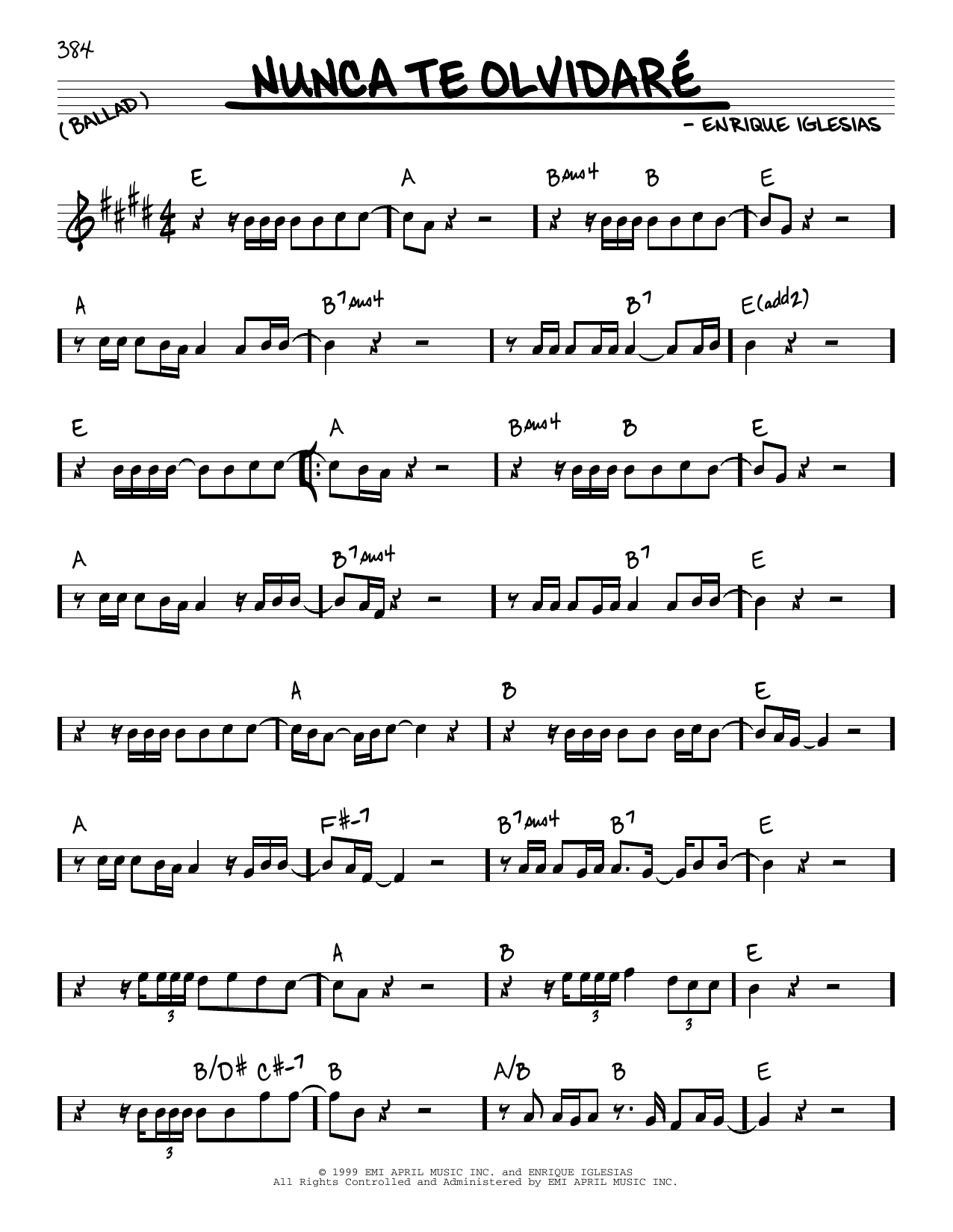 Download or print Enrique Iglesias Nunca Te Olvidare sheet music, chords and digital score arranged for Piano, Vocal & Guitar Chords (Right-Hand Melody). This Jazz score includes 6 page(s).