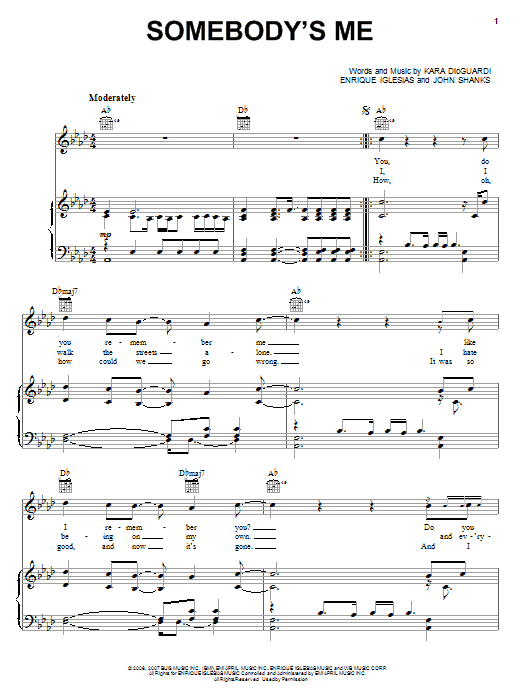 Download or print Enrique Iglesias Somebody's Me sheet music, chords and digital score arranged for Piano, Vocal & Guitar Chords (Right-Hand Melody). This Pop score includes 6 page(s).