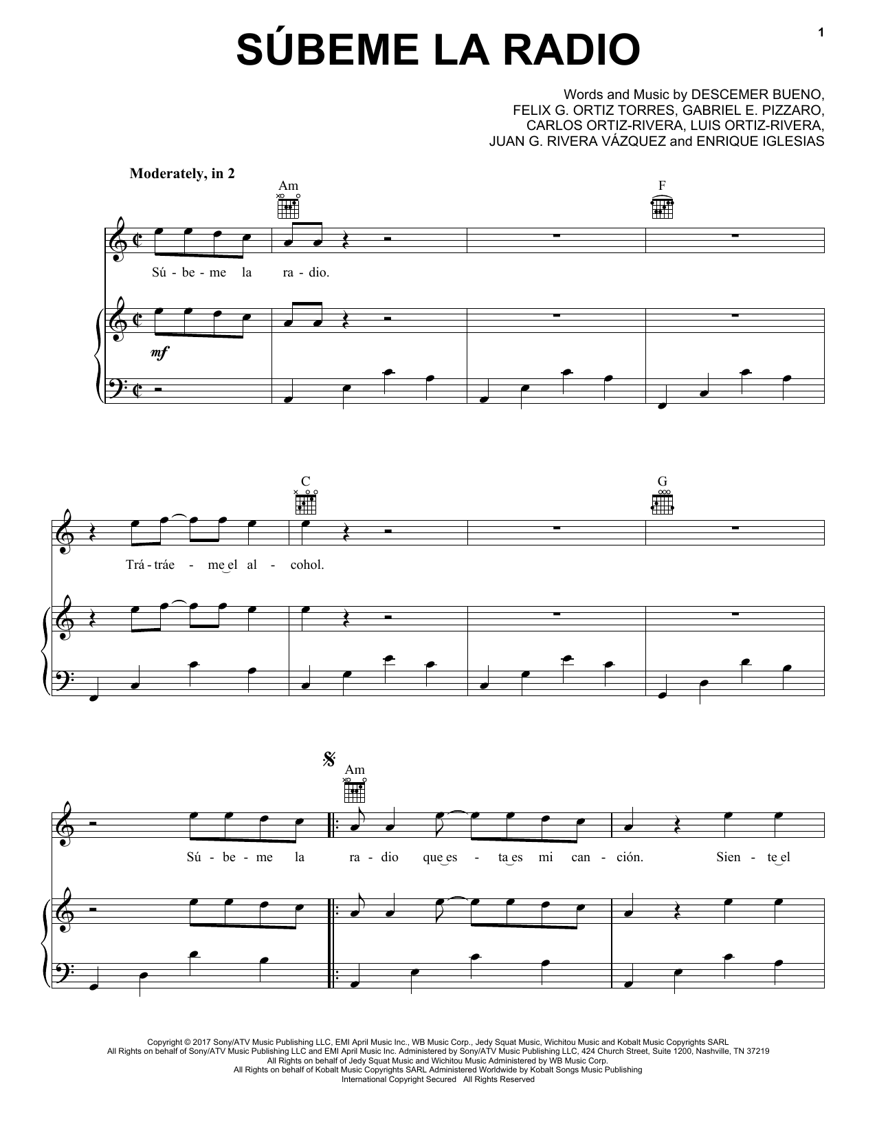 Download or print Enrique Iglesias Subeme La Radio sheet music, chords and digital score arranged for Piano, Vocal & Guitar Chords (Right-Hand Melody). This Pop score includes 8 page(s).