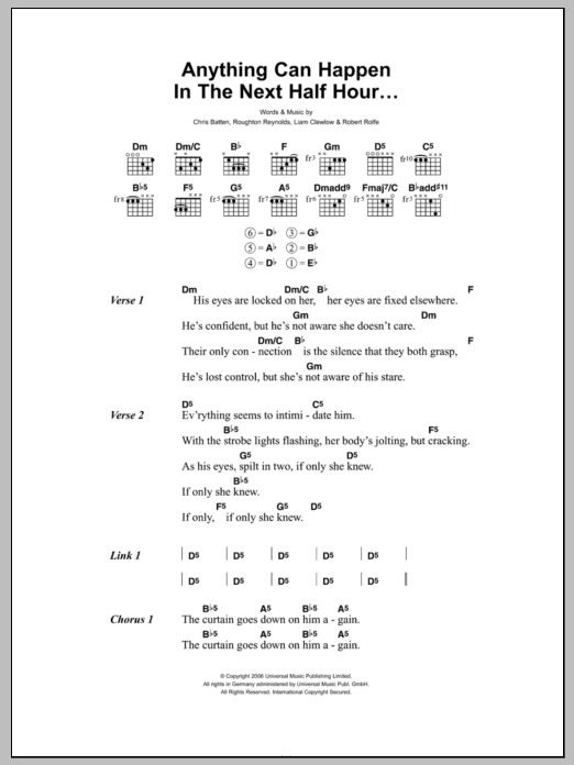 Download or print Enter Shikari Anything Can Happen In The Next Half Hour sheet music, chords and digital score arranged for Guitar Chords/Lyrics. This Rock score includes 2 page(s).