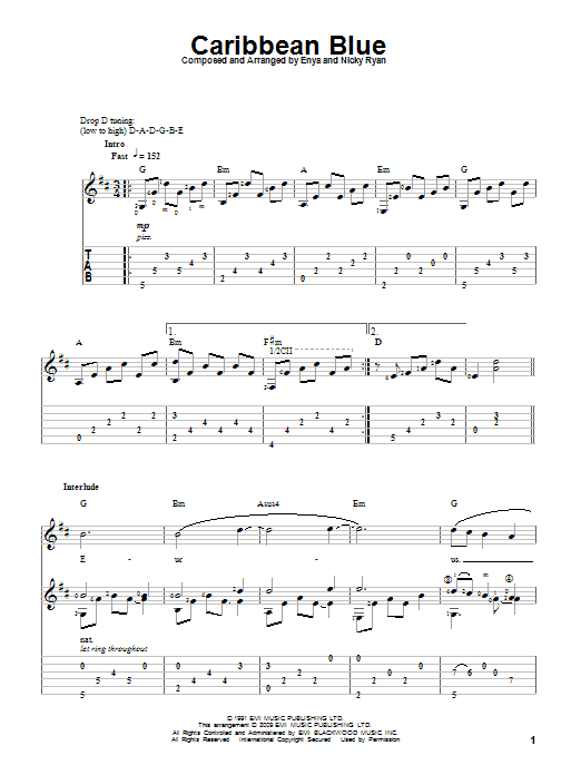 Download or print Enya Caribbean Blue sheet music, chords and digital score arranged for Solo Guitar. This New Age score includes 6 page(s).