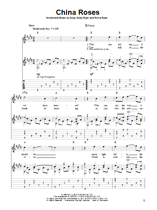 Download or print Enya China Roses sheet music, chords and digital score arranged for Solo Guitar. This New Age score includes 6 page(s).