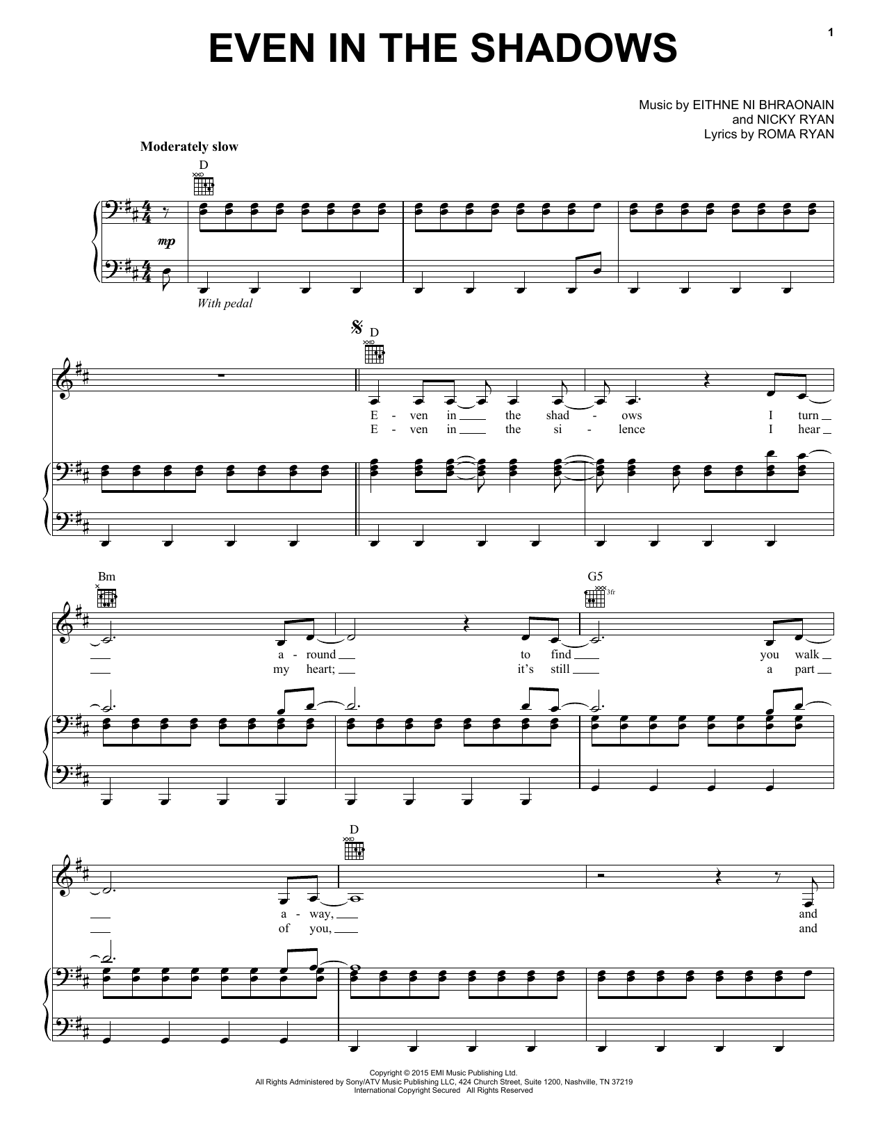 Download or print Enya Even In The Shadows sheet music, chords and digital score arranged for Piano, Vocal & Guitar Chords (Right-Hand Melody). This New Age score includes 5 page(s).