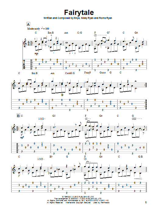 Download or print Enya Fairytale sheet music, chords and digital score arranged for Solo Guitar. This Pop score includes 2 page(s).