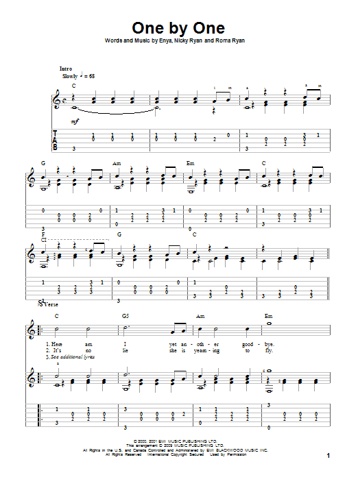 Download or print Enya One By One sheet music, chords and digital score arranged for Solo Guitar. This New Age score includes 3 page(s).