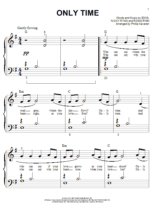 Download or print Enya Only Time (arr. Phillip Keveren) sheet music, chords and digital score arranged for Big Note Piano. This Inspirational score includes 3 page(s).
