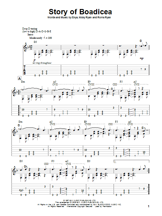 Download or print Enya Story Of Boadicea sheet music, chords and digital score arranged for Solo Guitar. This New Age score includes 3 page(s).