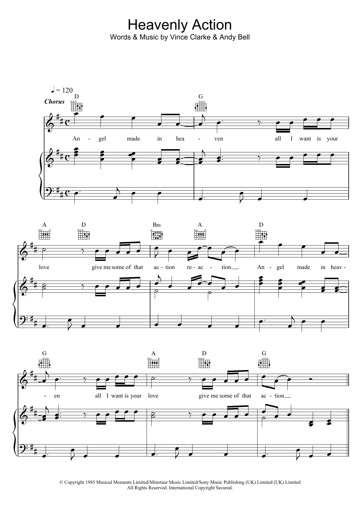 Download or print Erasure Heavenly Action sheet music, chords and digital score arranged for Piano, Vocal & Guitar Chords. This Pop score includes 3 page(s).
