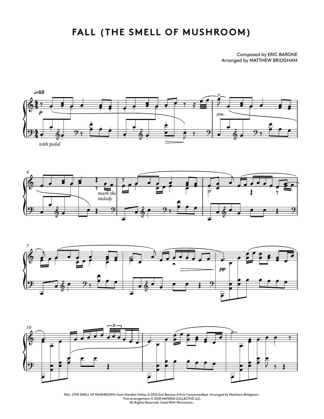 Download or print Eric Barone Fall (The Smell Of Mushroom) (from Stardew Valley Piano Collections) (arr. Matthew Bridgham) sheet music, chords and digital score arranged for Piano Solo. This Video Game score includes 4 page(s).