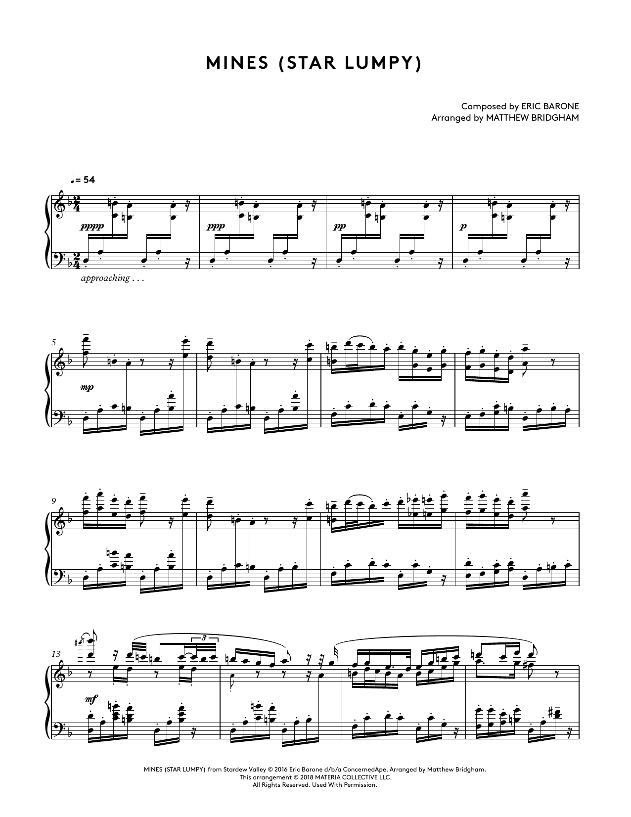 Download or print Eric Barone Mines (Star Lumpy) (from Stardew Valley Piano Collections) (arr. Matthew Bridgham) sheet music, chords and digital score arranged for Piano Solo. This Video Game score includes 3 page(s).
