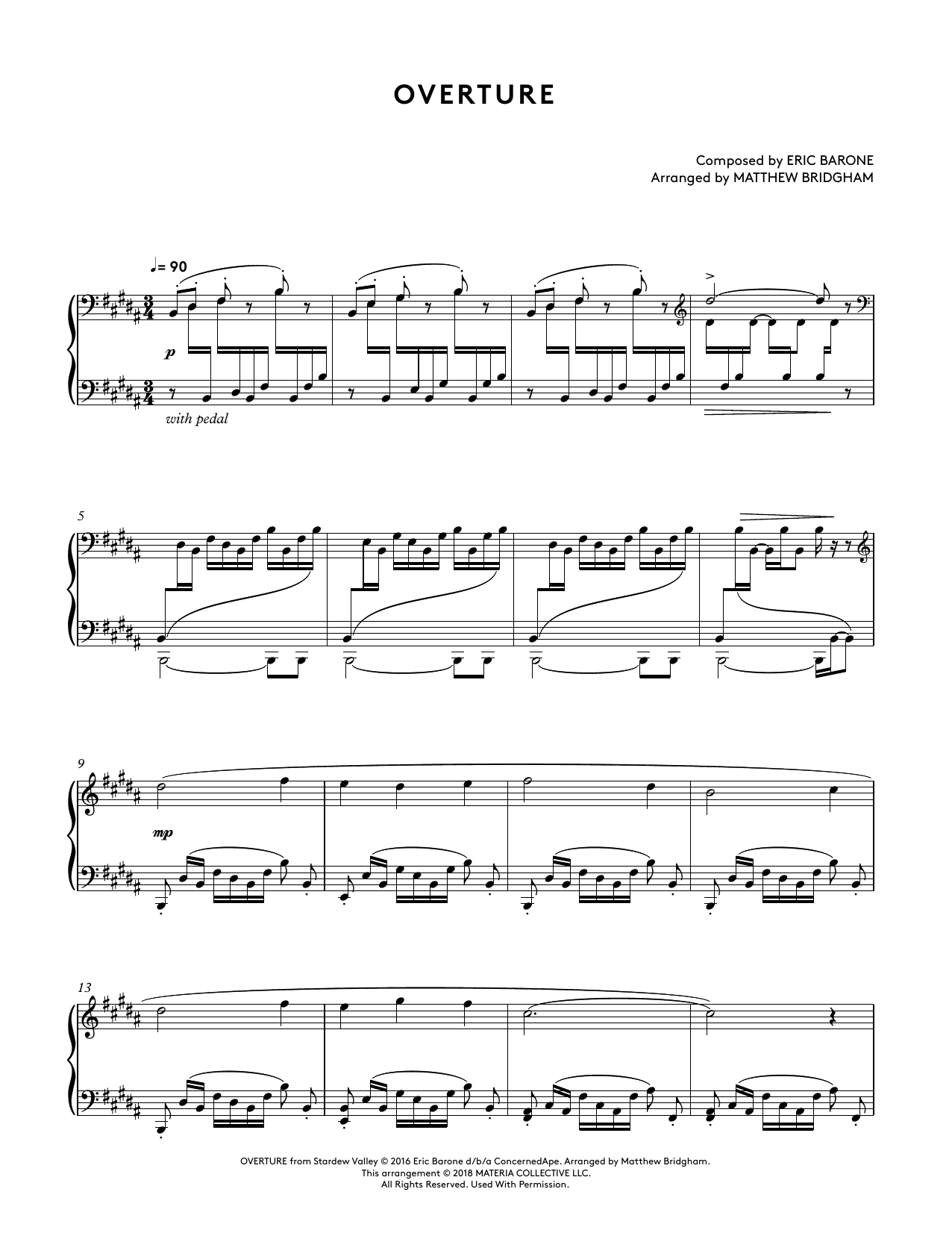 Download or print Eric Barone Overture (from Stardew Valley Piano Collections) (arr. Matthew Bridgham) sheet music, chords and digital score arranged for Piano Solo. This Video Game score includes 5 page(s).
